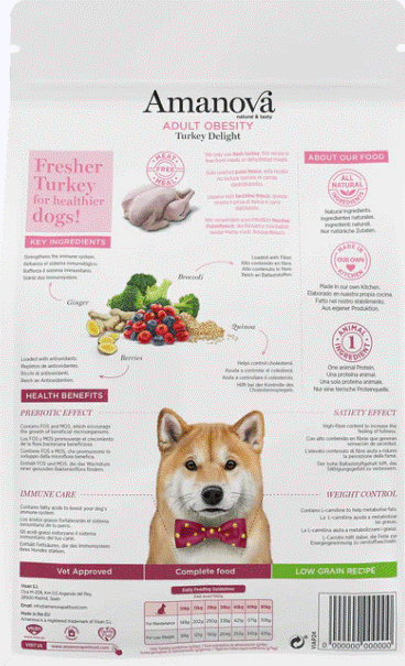 Amanova Adult Obesity is een heerlijke receptuur, die geen vleesmeel of gedroogd vlees bevat. De perfecte keuze om je hond in vorm te houden.